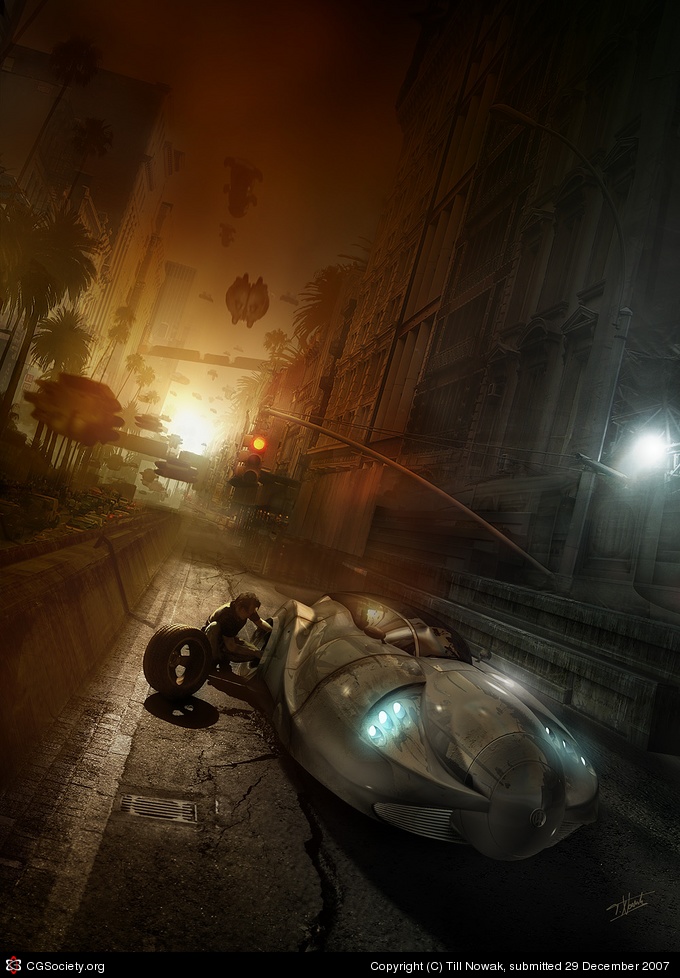 Una excelente imagen, sobre todo para un concept art por su estupenda ambientación. Buen dominio de la perspectiva (está creada sobre una imagen 3D), con una posición muy dinámica y unos colores cálidos en su fondo que contrastan con los tonos fríos del plano principal. Buena muestra de arte digital conceptual.